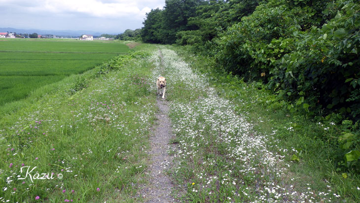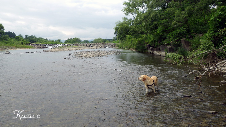 蒸し暑い一日。三男(愛犬)と近所の胆沢川へ。
