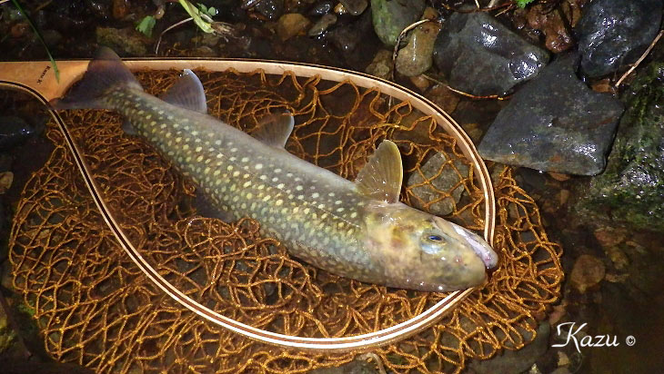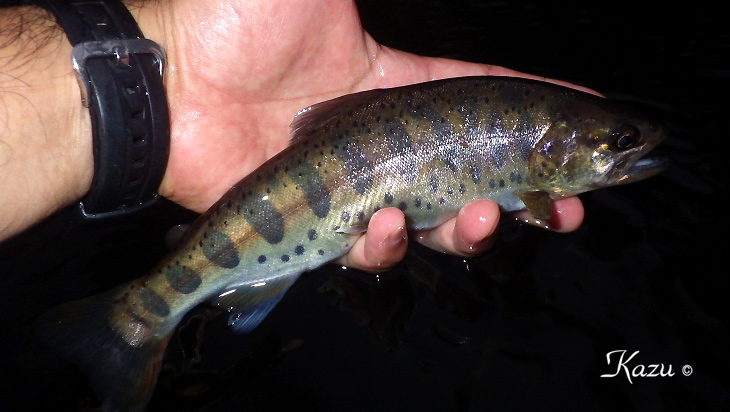19時30分頃、あたりは薄墨を垂らしたような薄闇の中。ど〜〜ん、と出てくれました。36.5cm.のデカデカ岩魚君。