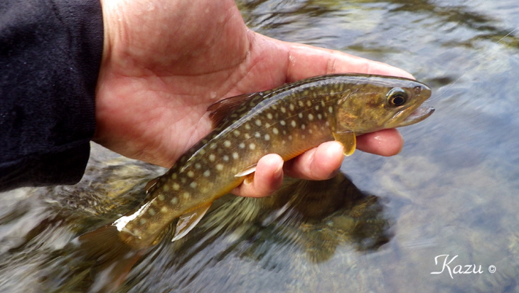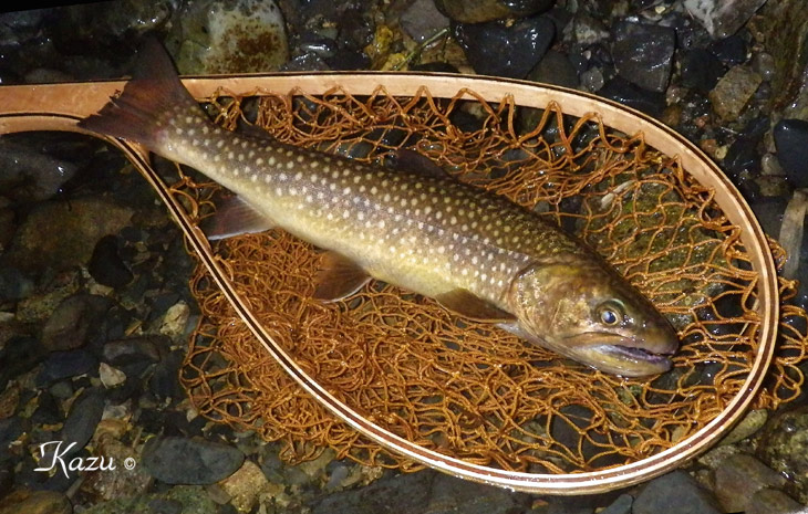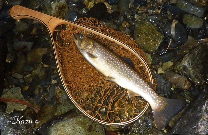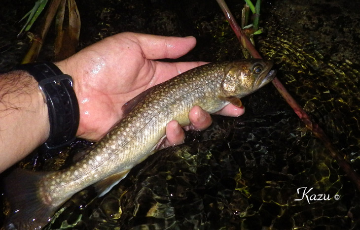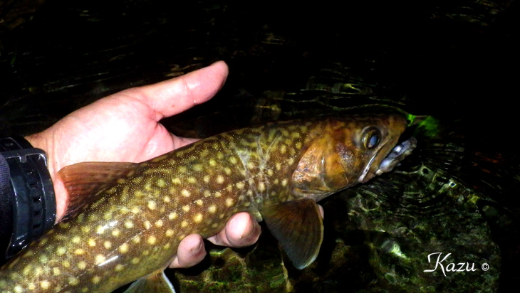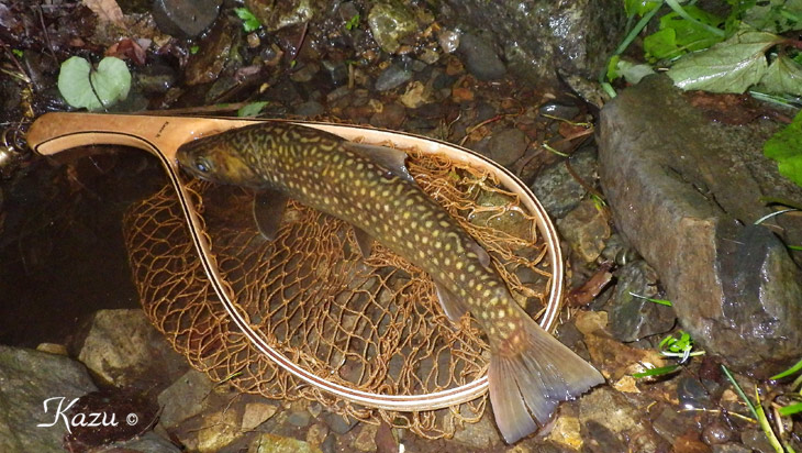 ドボン、とライズしていた岩魚君です。なんとかフッキングしてくれました。