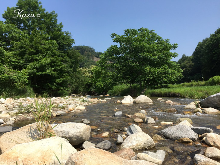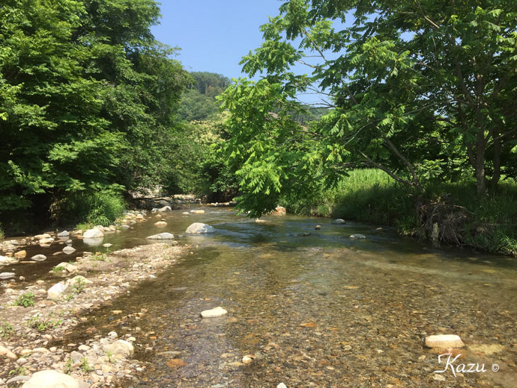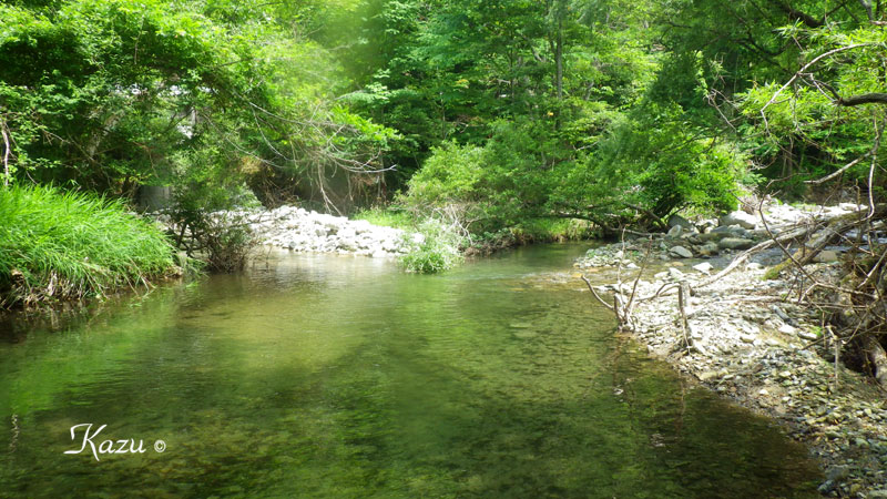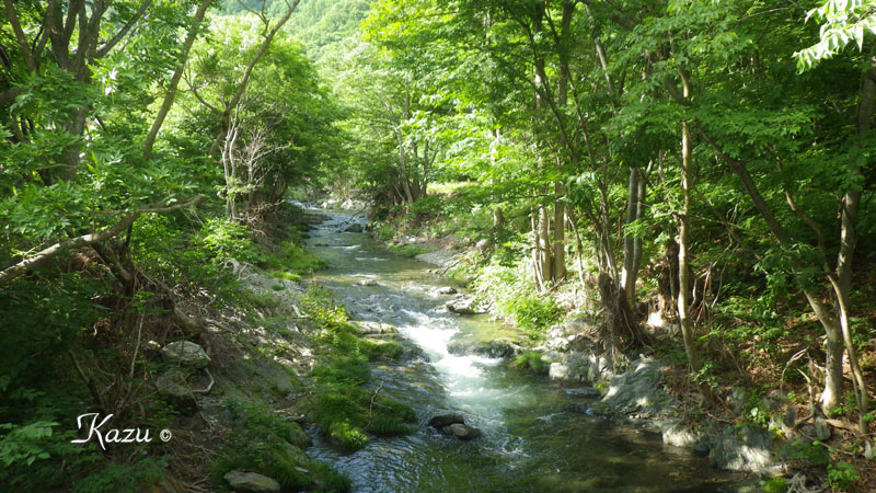 以前、ここでキャストしていたら、川岸の農夫が声をかけてくれて、沢水で洗ったトマトを分けてくれた。思い出の渓。何度か尺を上げている。