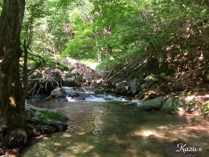 カンカン照りの日。初めて入る真夏の山岳渓流です。