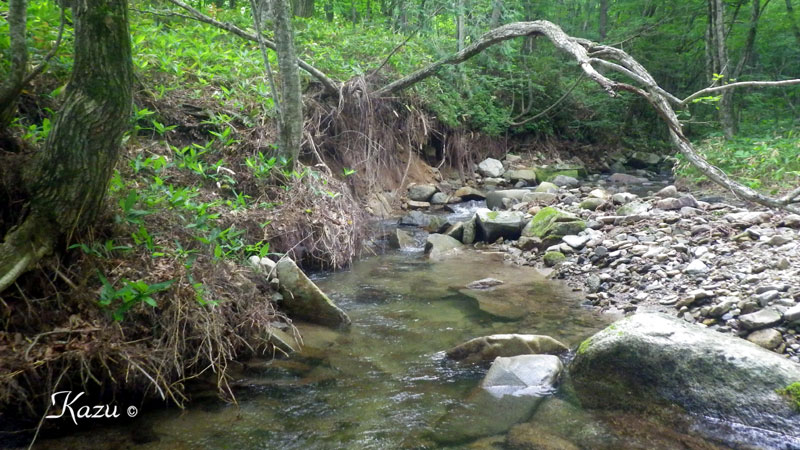 長雨の間の晴れ間の山岳渓流へ。 |