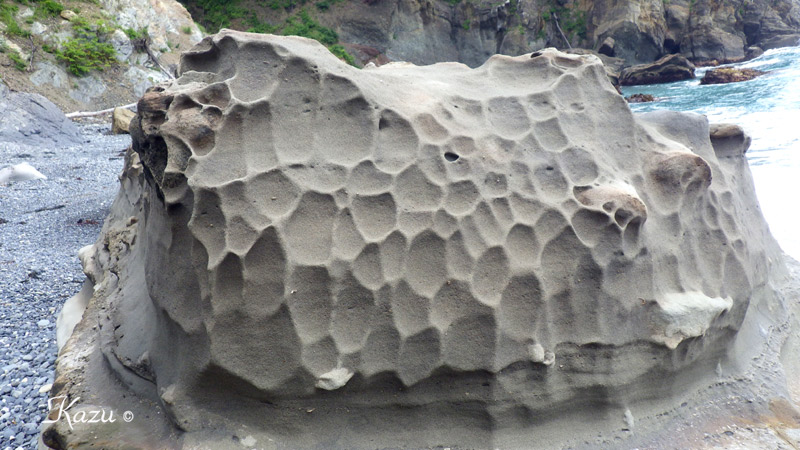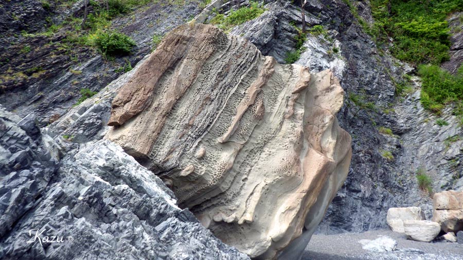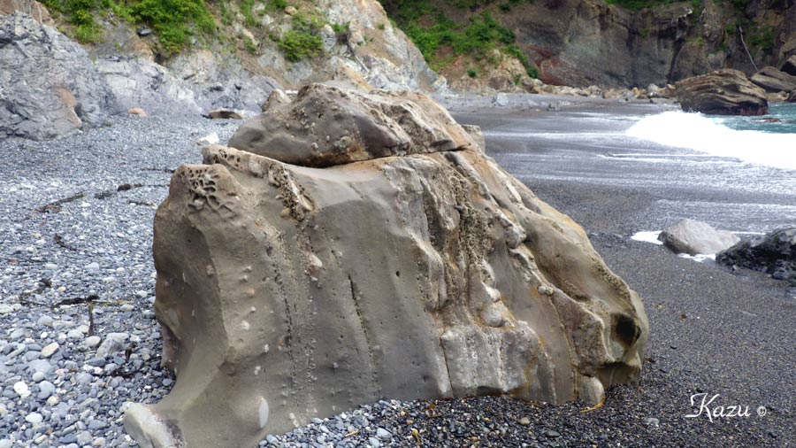 ハイペ海岸の巨大な津波石の一片。→解説