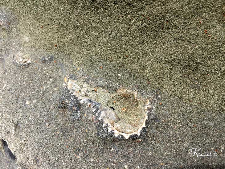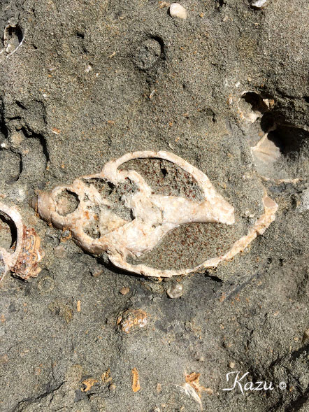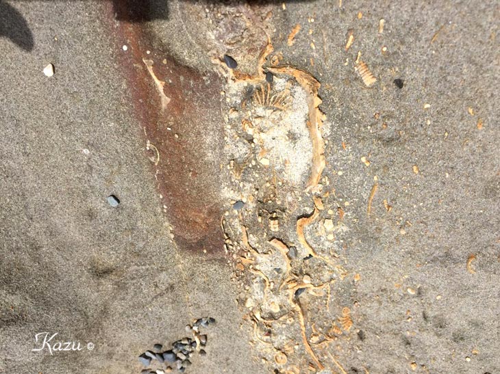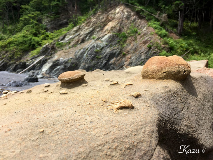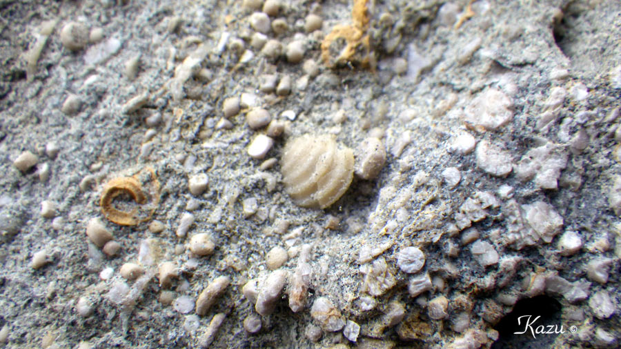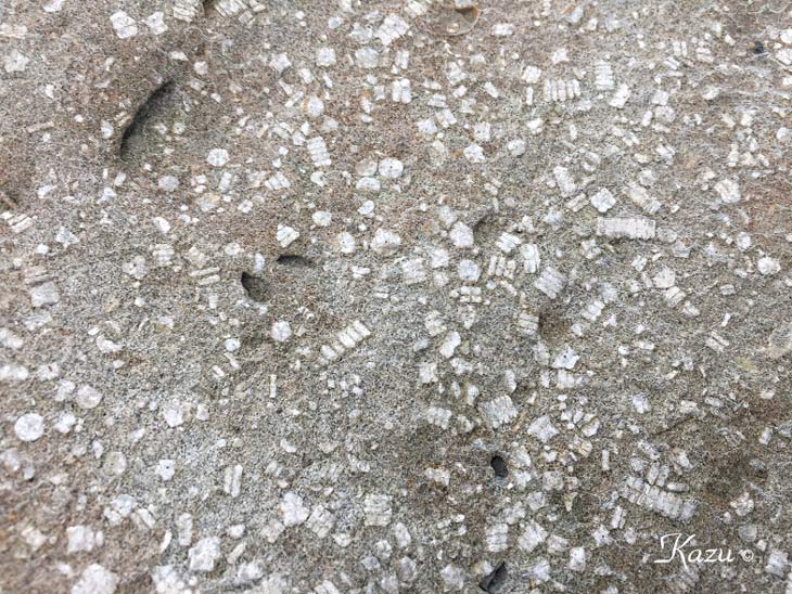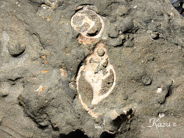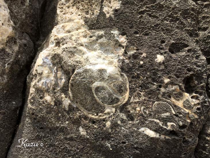 平井賀漁港付近の地層で見られた化石。1億1千万年前の白亜紀の物だとか。 →解説