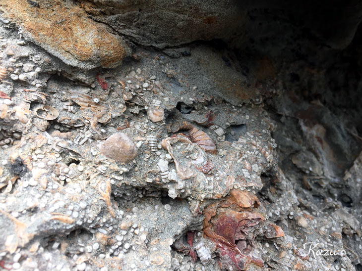 津波石に埋め込まれている化石群。→解説
