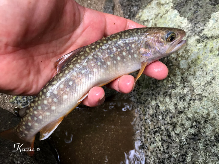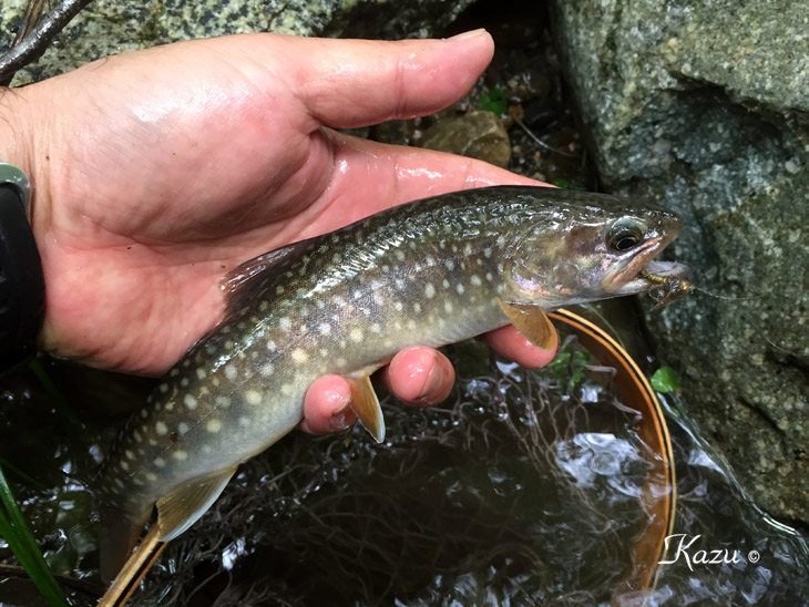 ビーズヘッドは最強ですね。一振りで素晴らしい山女魚が出てくれました。濁りを避けて、岩魚のポイントに入っていました。