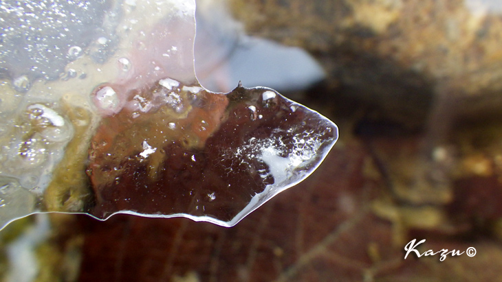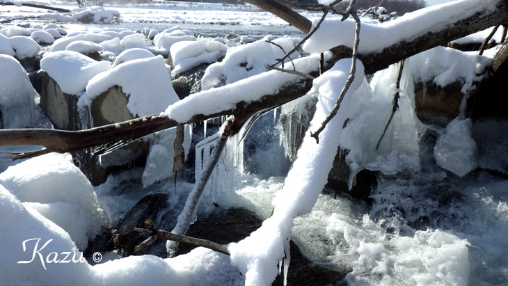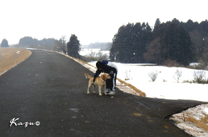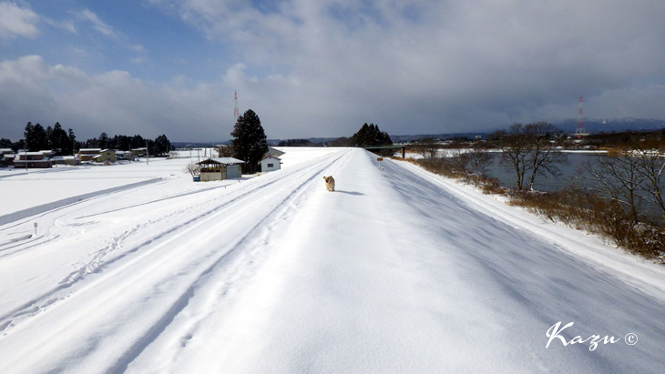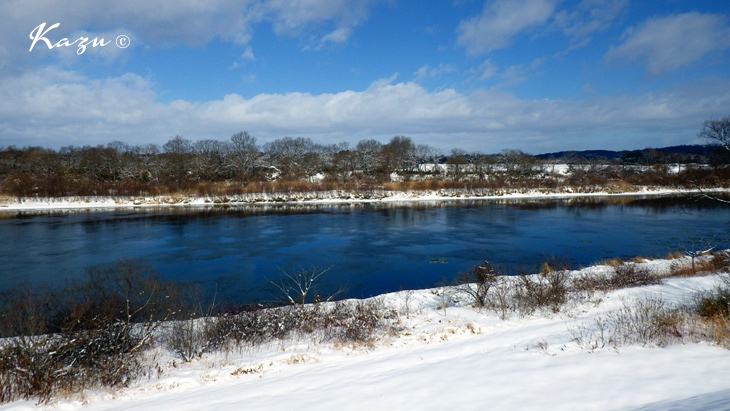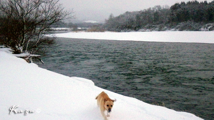 ジャムと胆沢川沿いの雑木林を散策。川は凍てついていました。