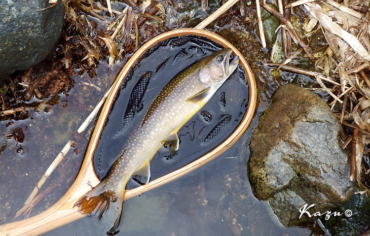 12時頃入渓して釣りあがると、渋く反応した岩魚が一匹。フライを#18ミッジに換え、ティペットを伸ばして再度プレゼンすると、良型が顔を見せてくれました。