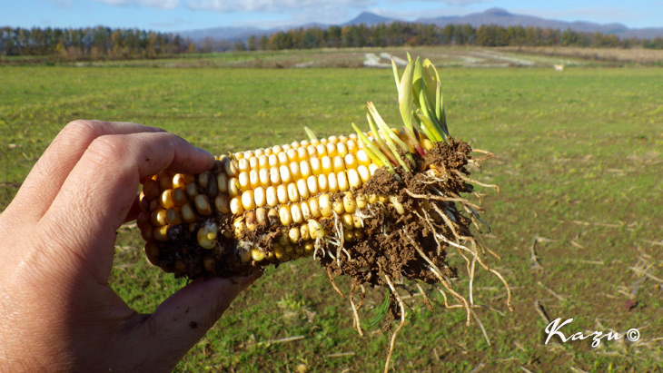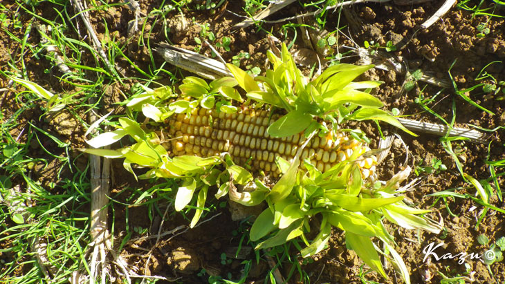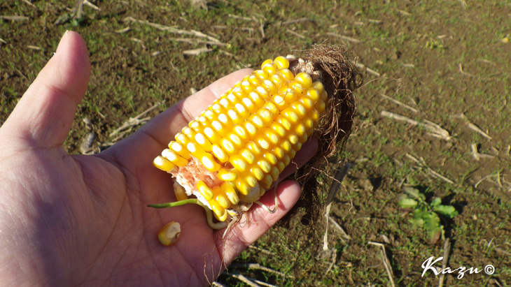 トウモロコシ畑の草原で刈り残されたトウモロコシを発見。