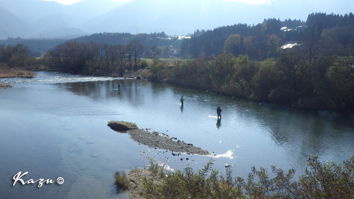 現着9時頃。三寒四温の小春日和。コンディションは上々でした。しかし、釣り人&釣り人・・・・。鱒より人が多い感じの流れでした。(ToT)/~~~