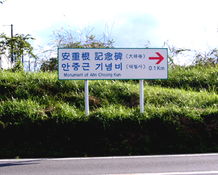 若柳 金成出口付近にハングル交じりのこのような看板が立っていました。よく見ると昨今マスコミを騒がせている「安重根」の記念碑が近くの寺にあるとの内容掲示。