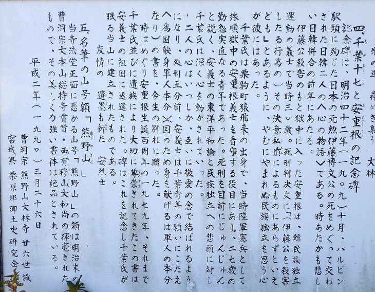 宮城県栗原市の大林寺です。安重根の看守をしていた千葉十七さんがここに記念碑を建立したものとここと。